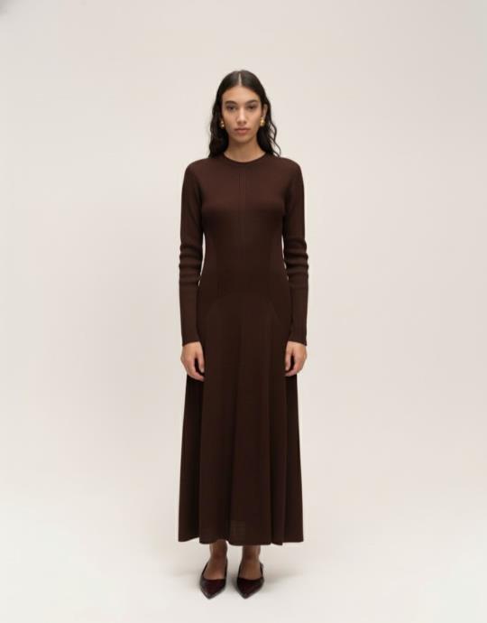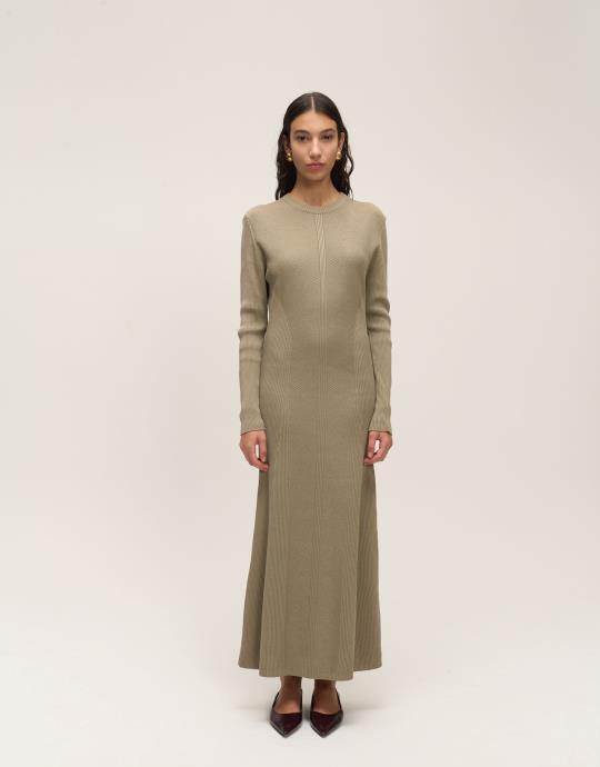 Belinde ve kol ucunda nervür detaylı. Yarasa kollu düz keten elbise.
