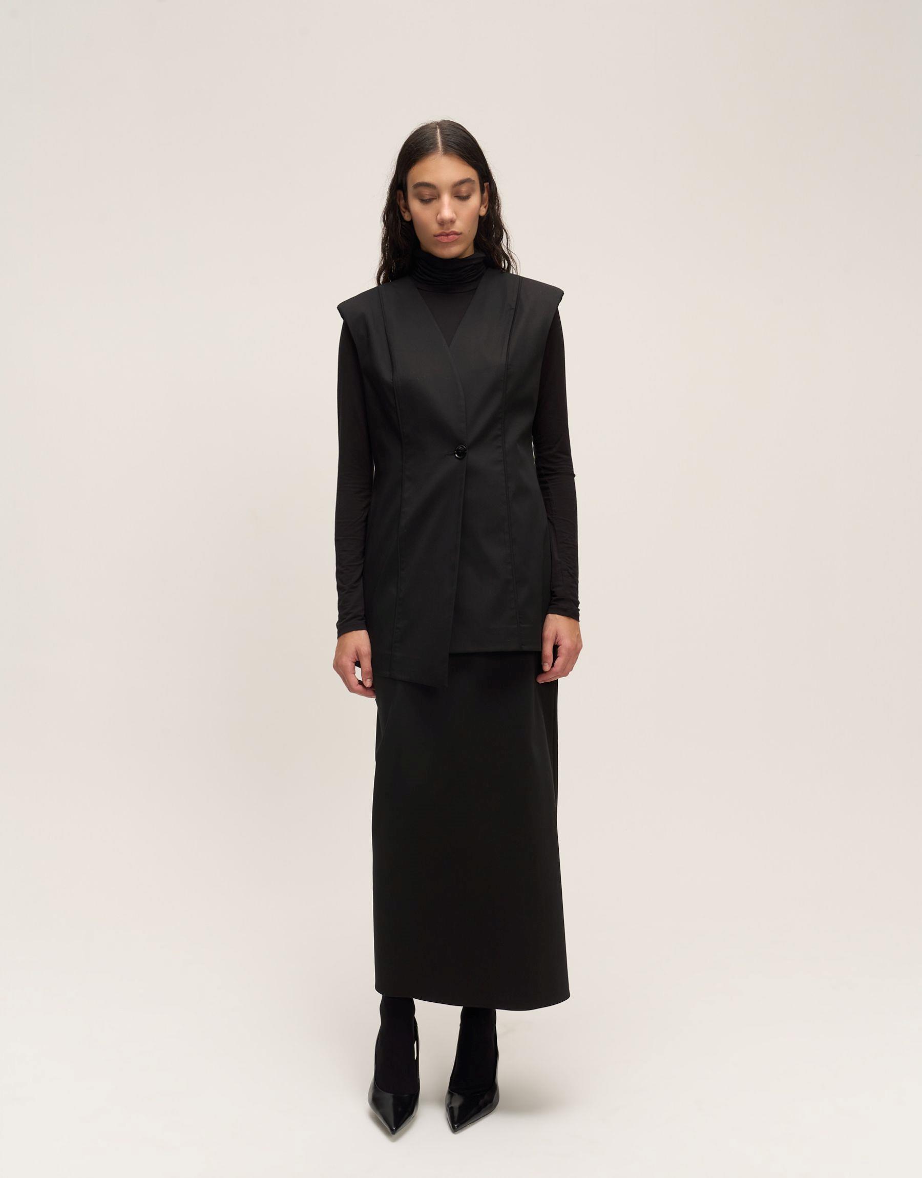 Modern zarafetin sade bir ifadesi. Minimalist çizgilere sahip bu asimetrik kesimli yelek, güçlü silüetiyle klasik ve çağdaş tarzı bir araya getiriyor. Tek düğmeli kapanışı ve omuz detayıyla sofistike bir görünüm sunarken, uzun formu farklı katmanlarla kolayca kombinlenebilir. Gün boyu konfor ve şıklığı bir arada isteyenler için mükemmel bir seçim.